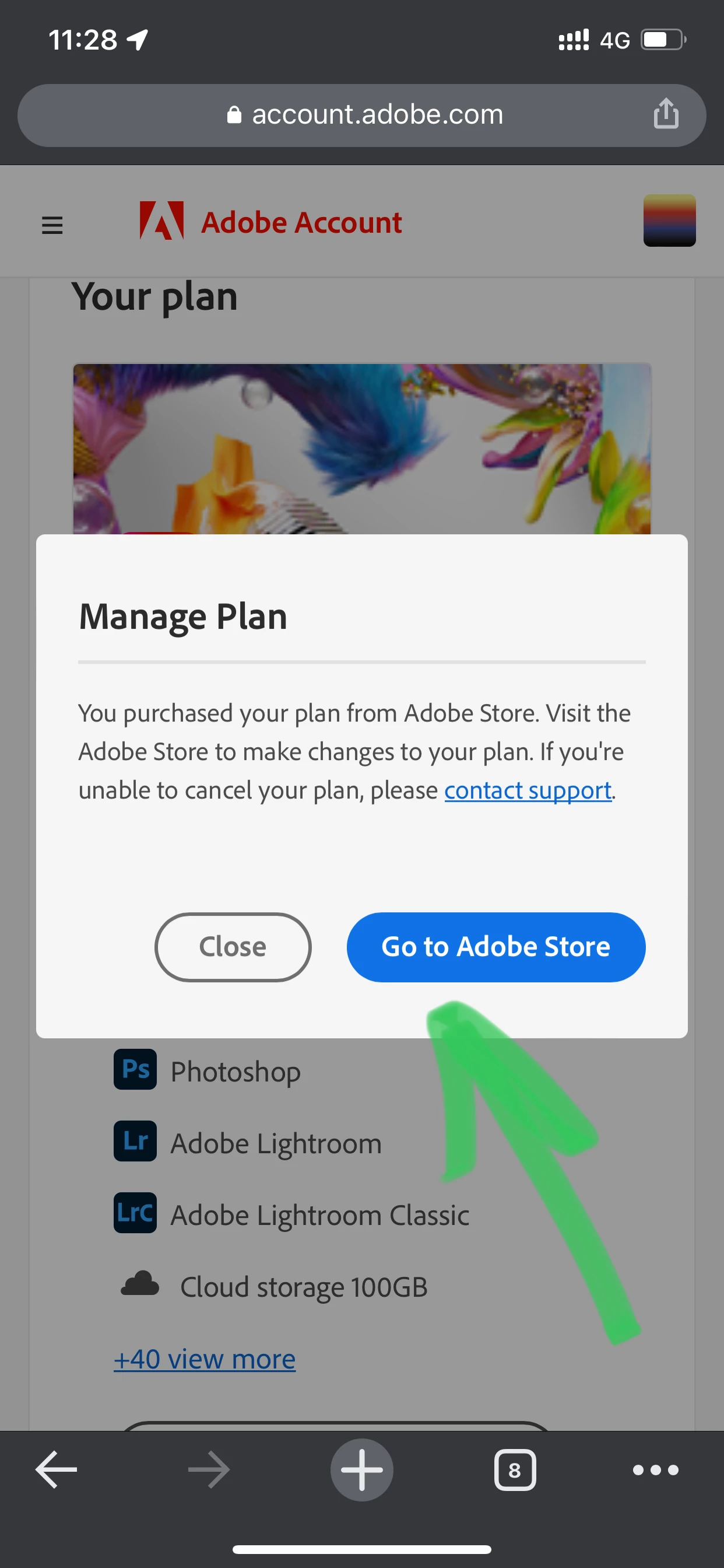 I am trying to cancel my Adobe CC subscription, when I click on “Manage Plan” it asks me to “Adobe Store”, and from there I can not cancel.