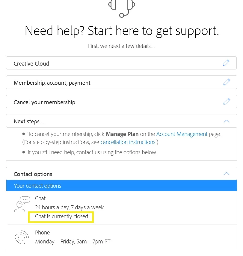 I want to cancel my current Creative Cloud membership. But I'm not able to! At my account page there's no "Cancel plan button". As i try to contact you i'm getting the error below, chat is currently closed / phone is available only on work days. My membership renewal date is today. Please help me!