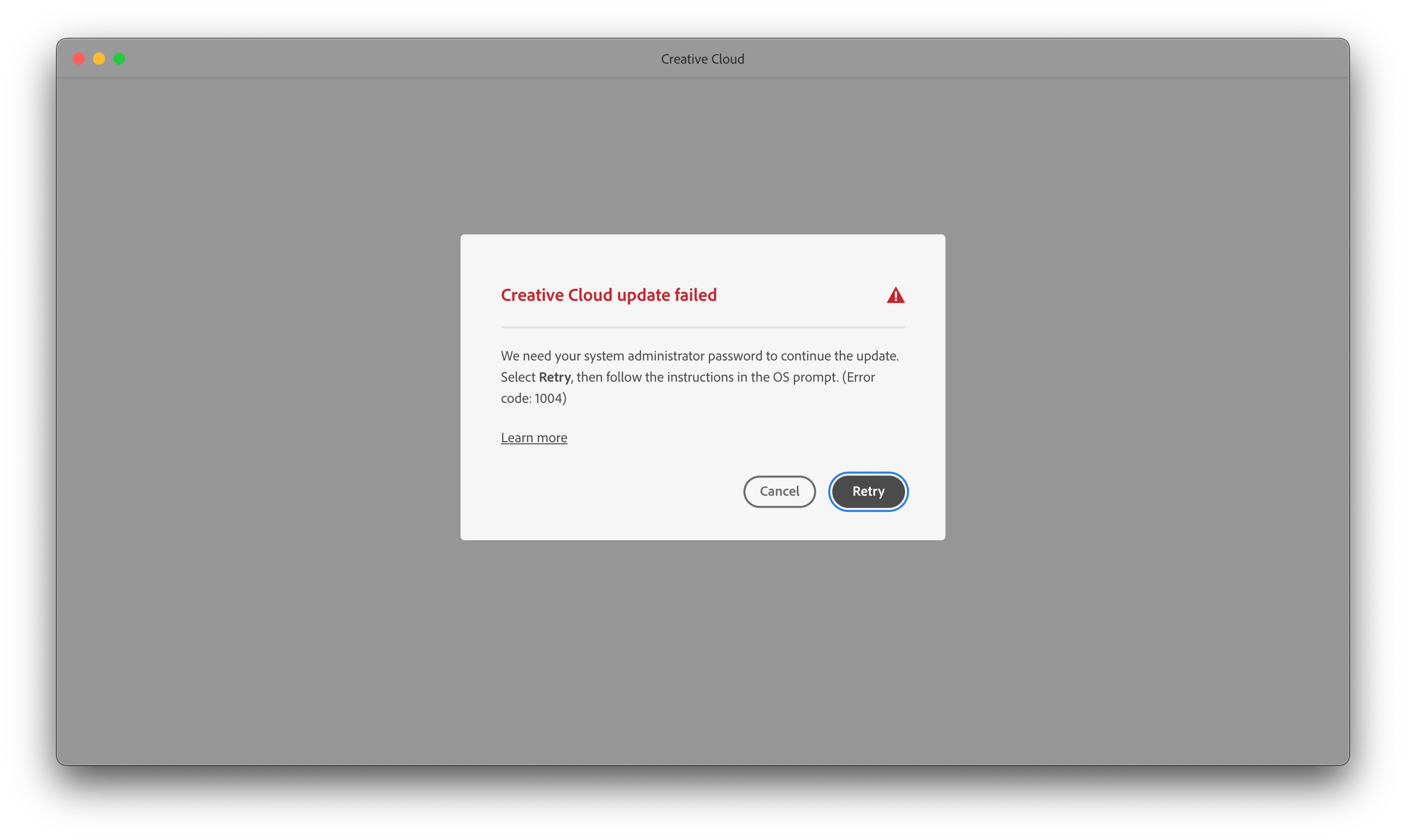 My Creative Cloud app says that I need an administrator password to update the app. I am the admin on my computer and I tried creating a new account with admin rights with no luck. The error code is 1004