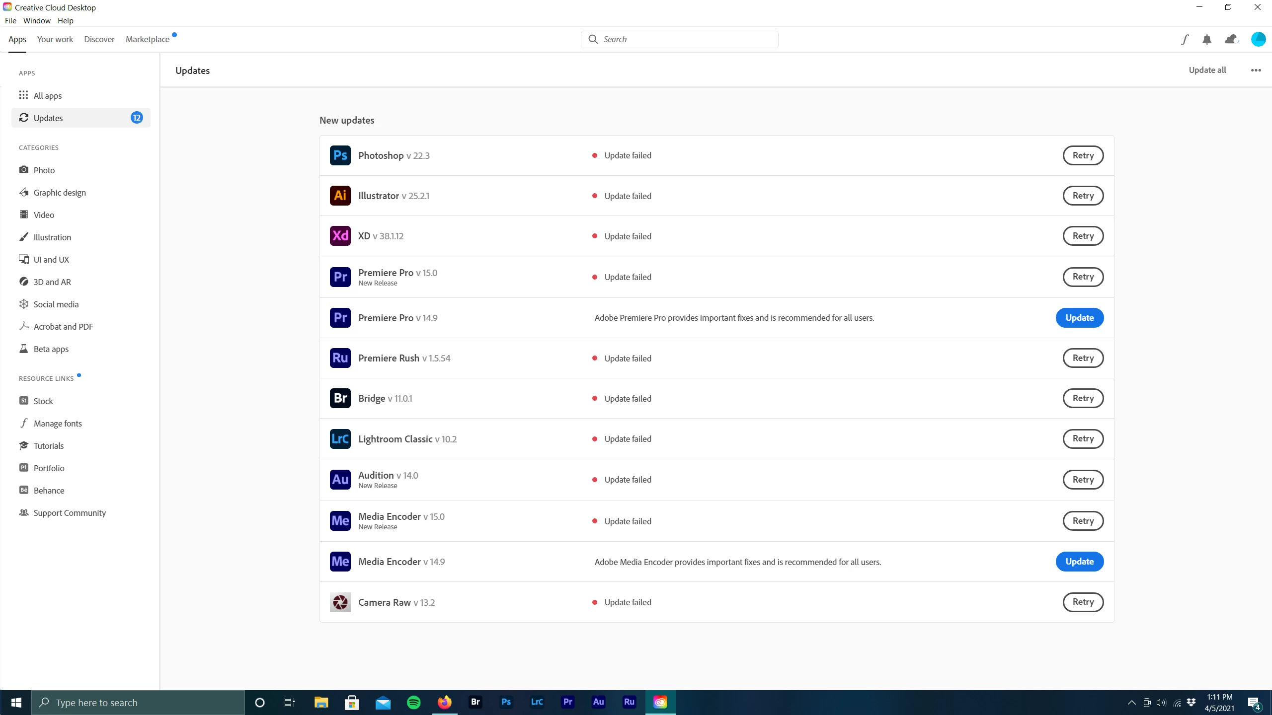 Seriously thinking about canceling my plan because I can't get ANY of my CC apps to update. It used to be where I'd have to retry downloads several times before they would finally cooperate and fully download, but now, nothing updates at all. Currently on a mesh wifi connection with strong signal. I don't have problems downloading anything else. I don't get an error code anywhere, so I'm at a loss for how to troubleshoot. At my wits end. Please help.