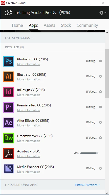 I installed Windows 10 about a week ago. Ever since, I haven't been able to use the CC Desktop App to install/update my apps. The App tab just spins (loading). I tried all the fixes involving removing the db file in the OOBE folder but nothing worked. Finally I used the CC Cleaner Tool to remove ALL of my Adobe programs then I uninstalled the CC Desktop App, restarted my computer and installed it again. The App tab loaded this time but when I tried to install all my software again it stalled at 85% on Photoshop (the first app I tried to install) - I left it for 20 hours with no interruption to the internet connection. I tried quitting the CC Desktop App and starting it again only to have the App tab just spin again. I went through the whole process again with the cleaner tool but this time I started with Acrobat DC instead of Photoshop. Now the CC Desktop App shows Acrobat DC at 90% (it's been that way for the last 3 hours - see screenshot below), however, Acrobat DC is installed. I can open it and it works fine. So now my problem is, how to get it to install other apps if the Desktop App thinks it's still trying to install DC. I'm almost afraid to quit the CC Desktop App for fear that the App tab won't load again.