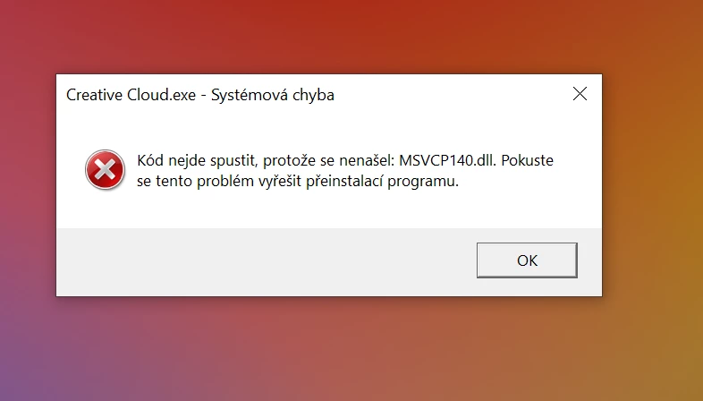 Při instalaci Creative Cloud se mi zobrazí nejprve okno. Systémová chyba: Kod nejde spustit, protože se nenašel MSVCP140.dll. A pak okno. Systémová chba: Kod nejde spustit, protože se nenašel VCRUNTIME140.dll. Už jsem to celé odinstalovala tím programem, co mi nabídla nápověda, a pak restartovala počítač, ale děje se to stále dokola. Máte někdo zkušenost prosím?