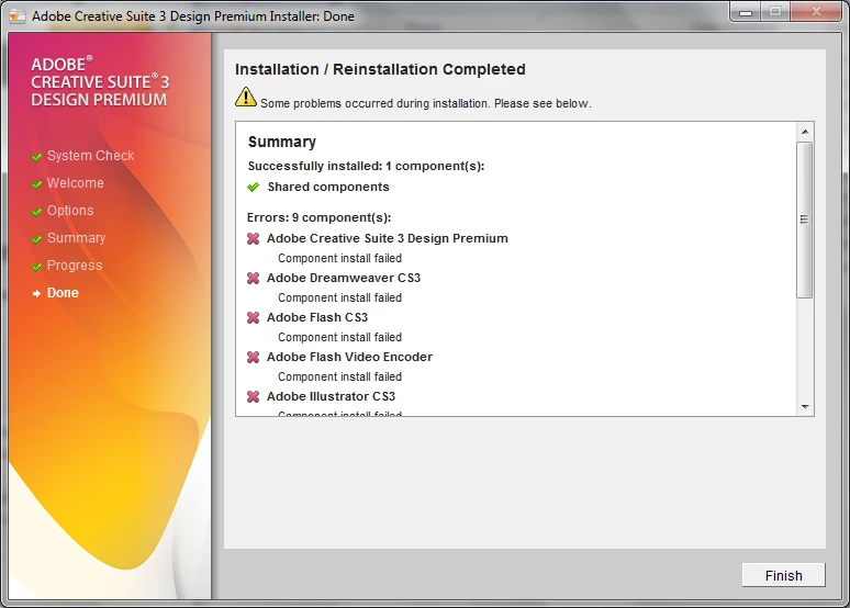 I have attempted multiple times to reinstall my Adobe CS3 update from online. It will go through the process and then in the end I get "Component Install Fail" (see image)