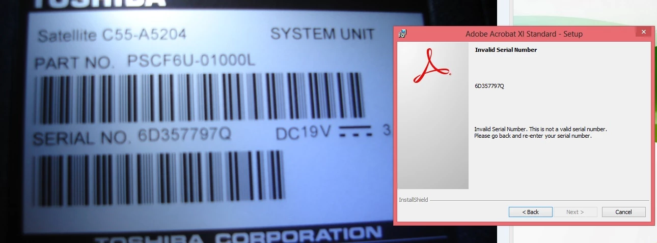 Why won't the Acrobat downloader accept my computer serial number? This is a new laptop and I'm installing Acrobat XI for the first time.