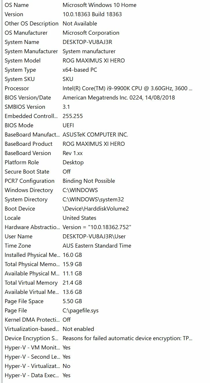 See below System info. My graphics card is a 1080ti. My c drive has 9gb space on it. I use an Acer Predator x27 4k Monitor.