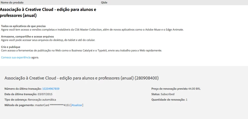 I just made a Stdent/Teacher creative cloud account, and after download CC 2015 version, it cames like trial. After some research I found that my plan just bought the CS6 version! Anytime when I bought I saw this, or someone told me!