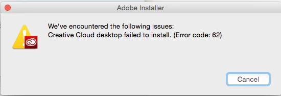creative cloud application will not install. Keeps erring with and code 62.