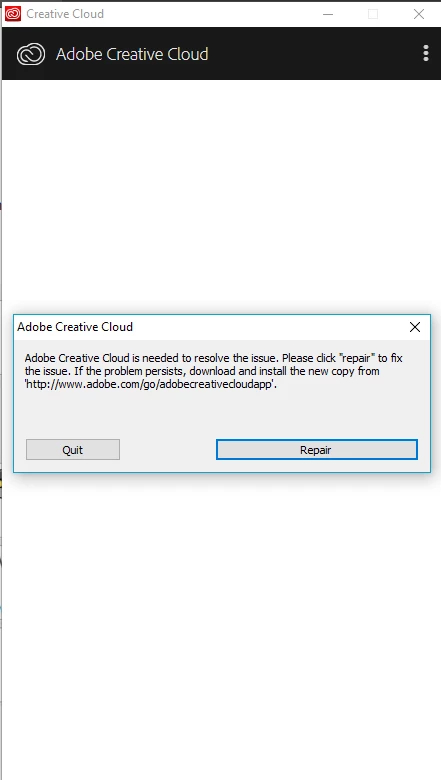 Anytime I boot my computer, Creative Cloud won't start. I get this error below. When I try to start it, it just sits and spins for 10 minutes before the message is repeated again. I have done what the message says to do and the result is the same.