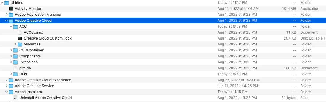 The only mention of the Creative Cloud is in the Utilities folder under Applications (screen cap below)