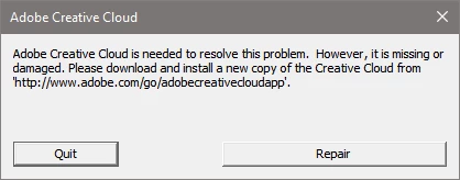 I also get a persistent repeating message saying, "Adobe Creative Cloud is needed to solve this problem. However, it is missing or damaged. Please download and install a new copy of the Creative Cloud from 'http://www.adobe.com/go/adobecreativecloudapp'." with options to either "Quit" or "Repair"