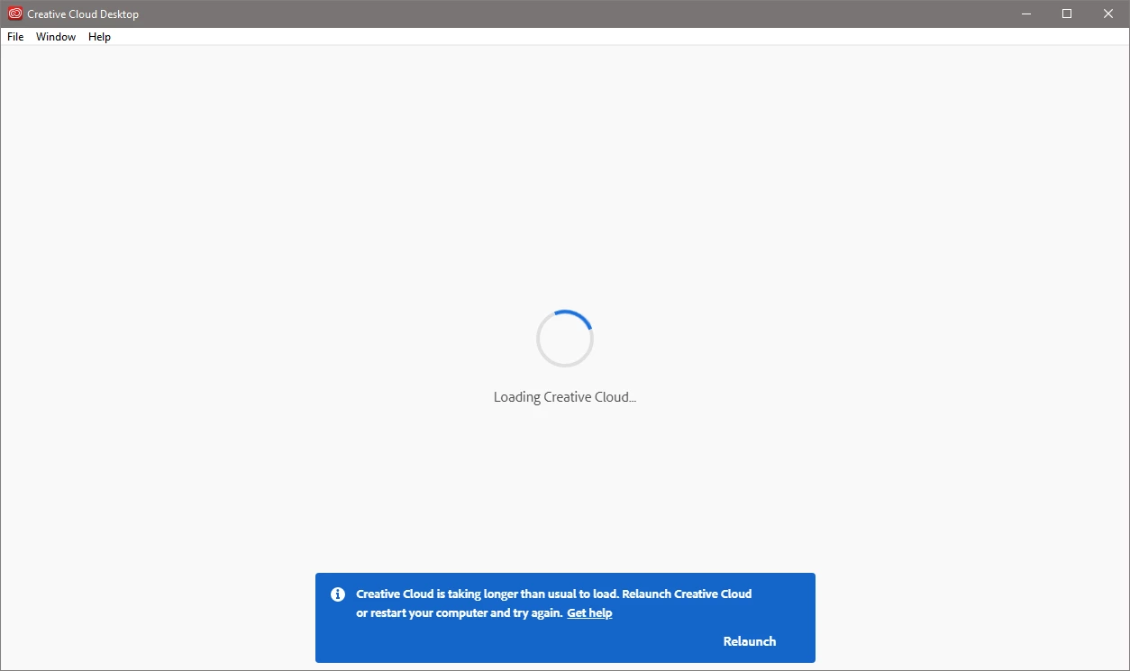 The CC Desktop app window is empty except for spinning wheel, plus message "Creative Cloud is taking longer than usual to load. Relaunch Creative Cloud or restart your computer and try again" with options to "Get help" or "Relaunch".