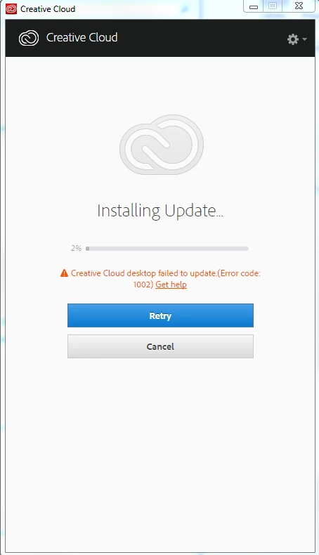 When I run Adobe Creative Cloud, it gets to 2% and then displays this message: "Creative Cloud desktop failed to update(Error code:1002) Get Help."