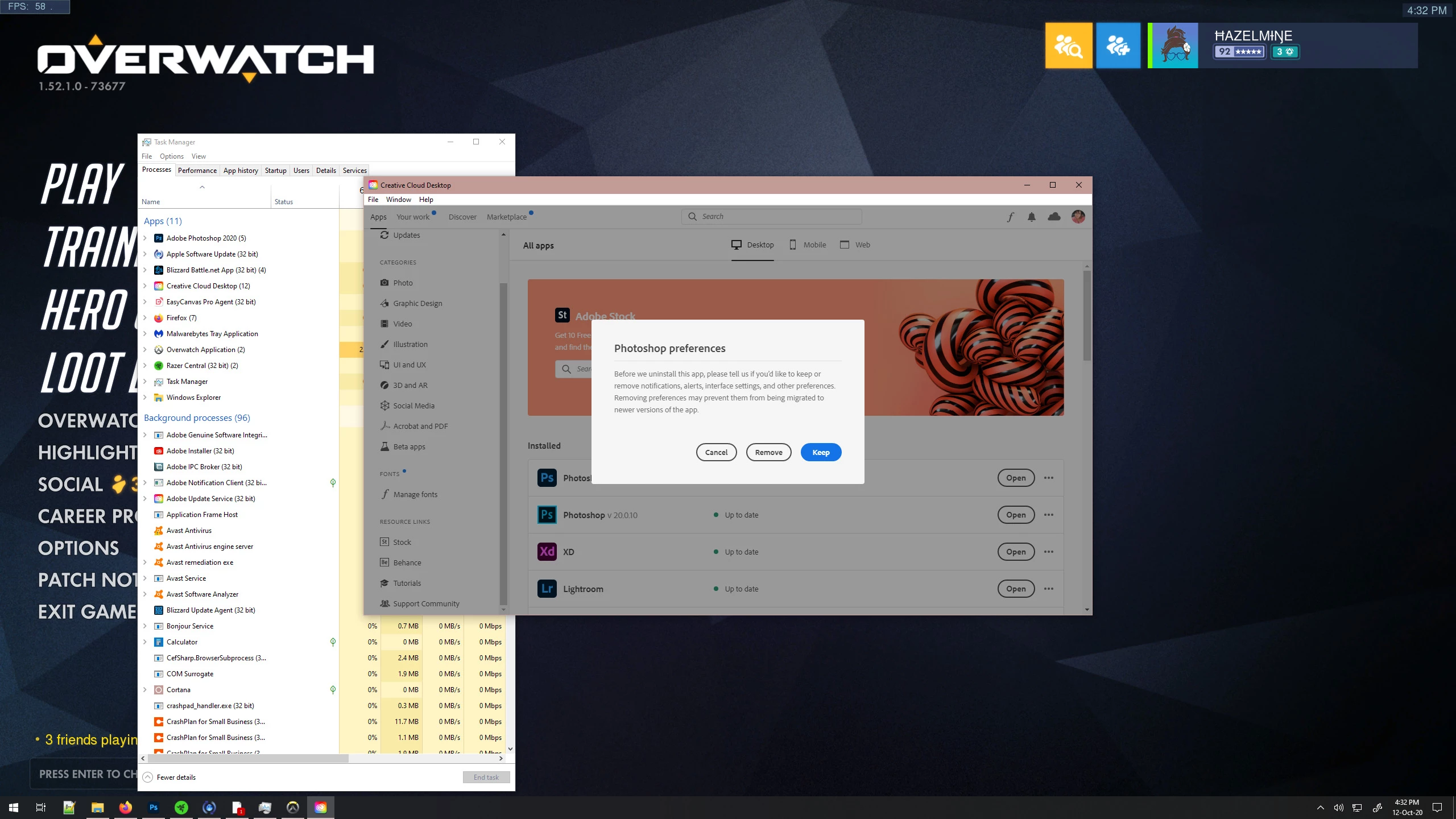 About 2 updates ago, I started having issue with the CC desktop. I can be playing Overwatch, Sims 4, browsing web pages and Creative Cloud will pop open and ask if I want to save my preferences. Is this a bug? I did uninstall version 2018 of Photoshop and after that, this pop up will not go away. It opens randomly whenever I am on the computer, no matter what program I am using.