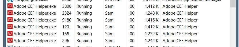Whenever an update is available and I try to install it everything seemingly goes normal, until the progress bar gets near 90%, then it just closes the window. The Creative Cloud background process will keep running and will be hogging resources, but the installation never seems to finish, longest time I have waited on it has been 9 hours. When I tell my computer to restart there is no pop-up telling me a process is still running and needs to be closed or anything.