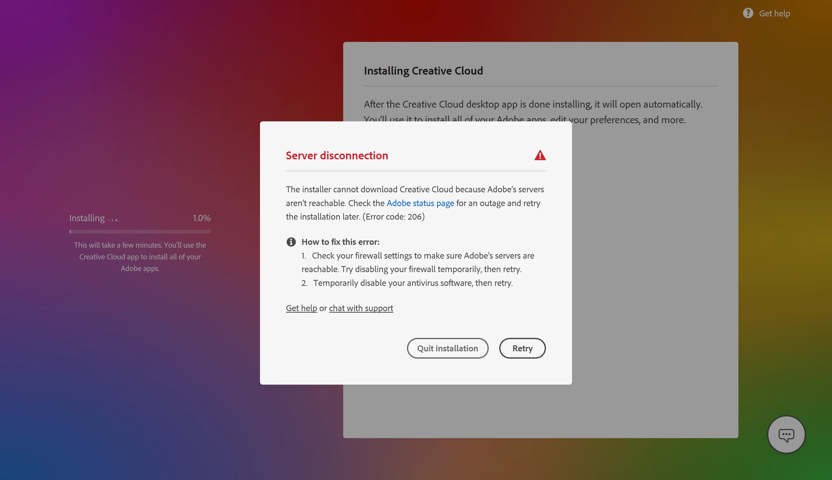 Creative Cloud Installation Error Code 12029 and Error Type -50