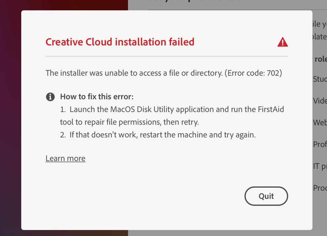 Every time I reinstall I get an error message, "The installer was unable to access a file or directory. (Error code: 702)"