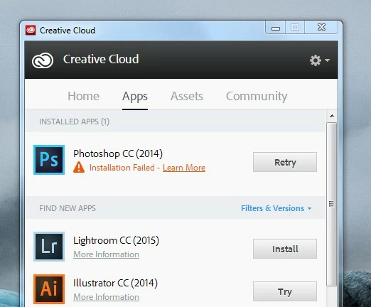 Thanks to all of the help provided I have solved the initial problems and Creative Clod is now installed and appears to function. However, when I try to install Lightroom or Photoshop it stops on 0% and I get this message.