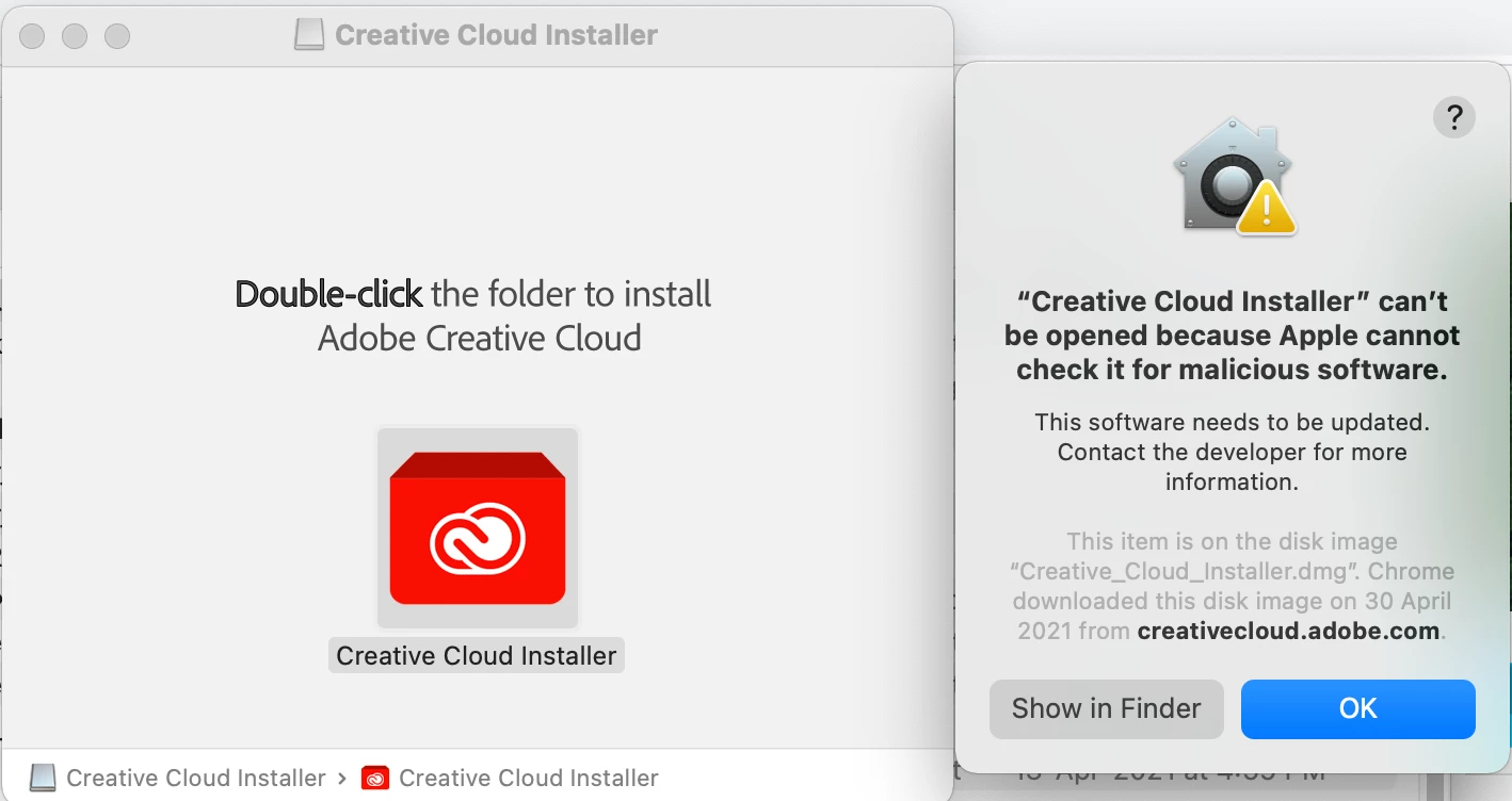 I am getting this error while installing "Creative_Cloud_Installer.dmg" - what could be the reason and how to fix this ?