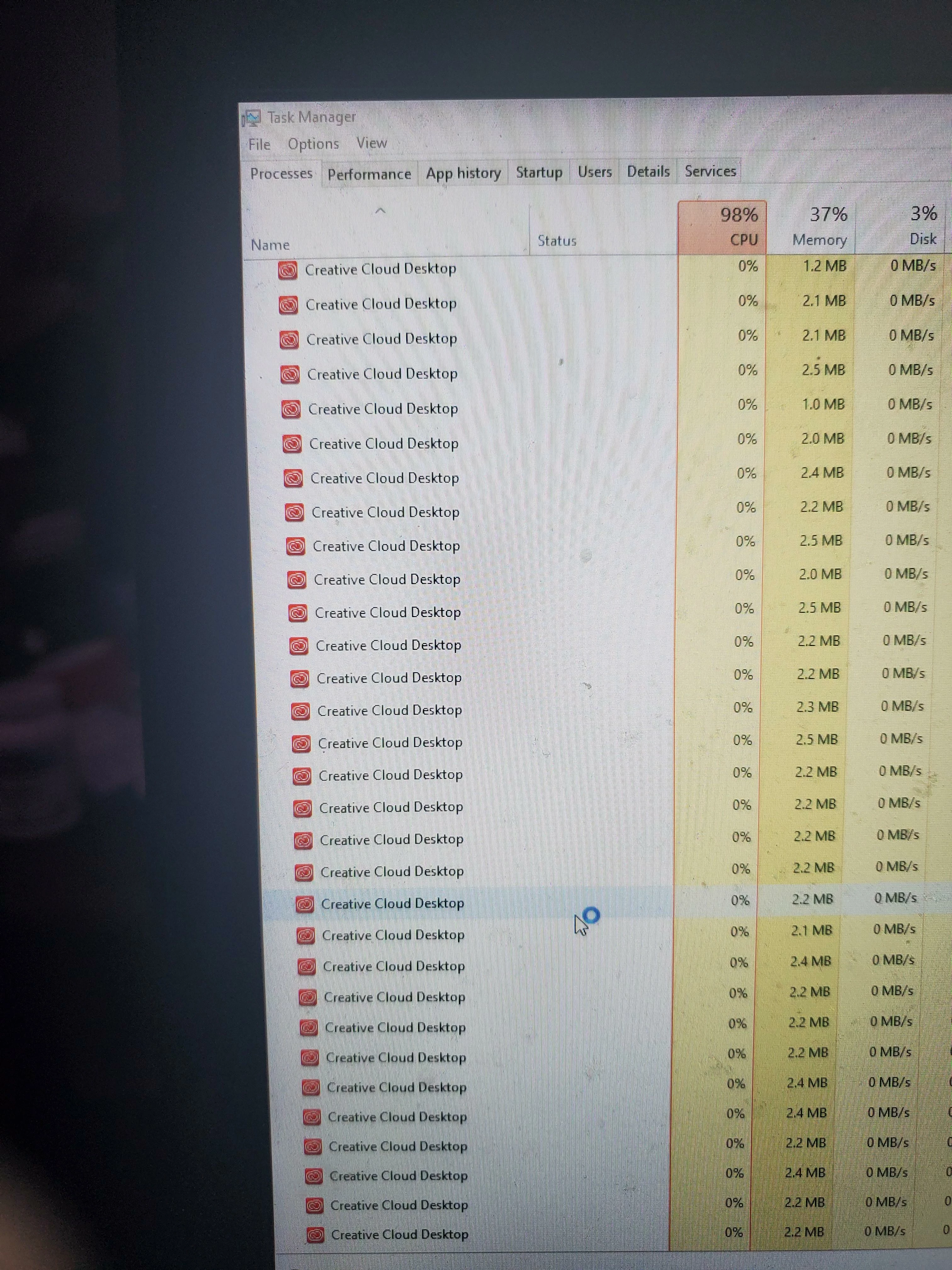 I am wondering if someone can help explain why Creative cloud launches multiple copies on startup? I have turned off the start at launch option, but that seems to have no effect. It holds up my computer for a good 10-15 minutes every time this happens. It starts so many copies it maxes out my CPU. See attached photos and video of CC freaking out at boot. I have also tried a full reinstall and that seems to make little difference. This is the only application that does this