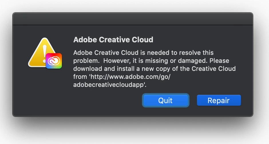everytime I turn on my computer I receive this error message (attached) from adobe saying creative cloud must be repaired and reinstalled. adobe support had me download their uninstaller and remove the creative suite completely and then reinstall but that seems to actually have now made matters worse as I have to go through this reapir and reinstall process at least twice every morning to use adobe software. any help or insight would be greatly appreciated because this issue is super frustrating!