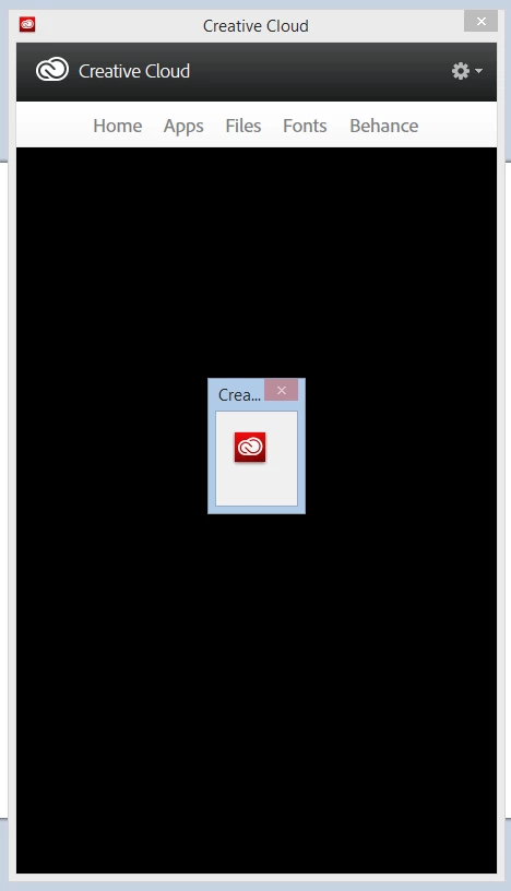 My Creative Cloud application no longer lists any applications. It just displays a small window with the creative cloud logo in it (see attached image). I can't close the small window, and can't click any options on the larger window. I have to use Task Manager to kill it.