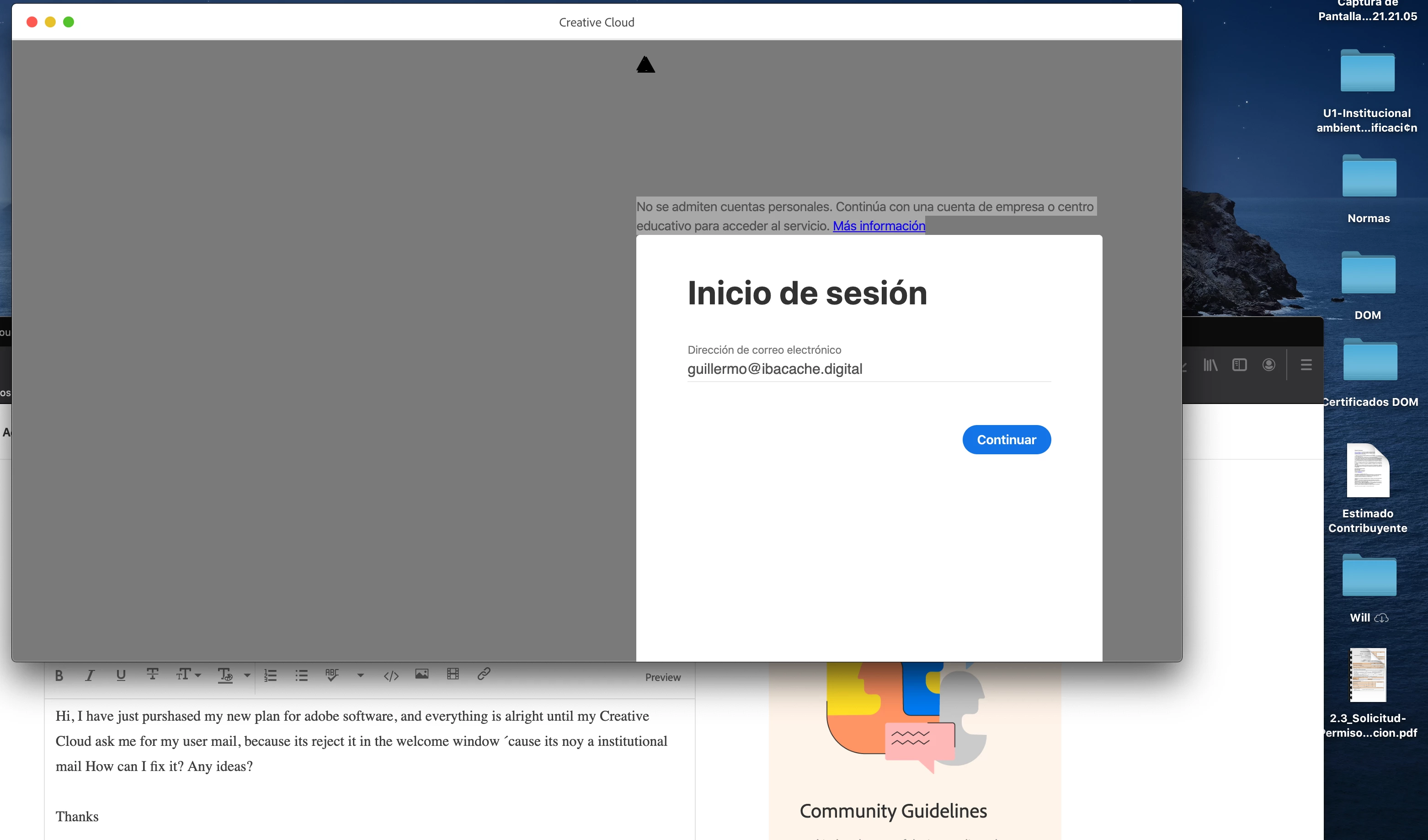 Hi, I have just purshased my new plan for adobe software, and everything is alright until my Creative Cloud ask me for my user mail, because its reject it in the welcome window ´cause its not an institutional mail How can I fix it? Any ideas?
