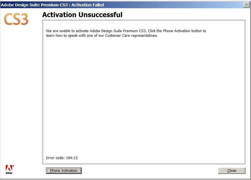 I want to activate my CS3, but the phone activation is no longer supported and online activation returns "unsuccessful" and error code 194:12. The customer support wants to have nothing to do with that.
