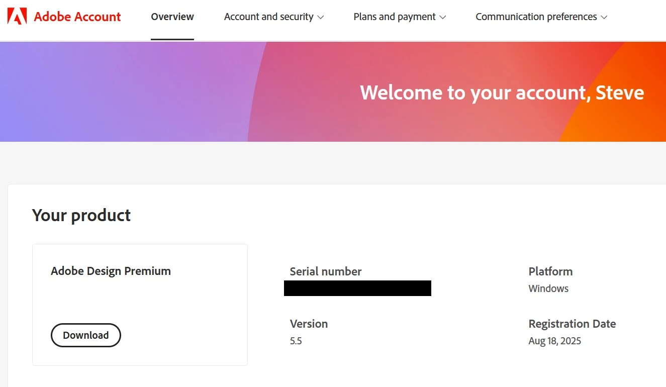 This software is legitimately registered to me, and the serial number appears under my Adobe Account page. It’s a TLP license key, originally purchased for our design department. I have the original installer media (ISO copies) as well as the installer download from Adobe’s Manage Account page.