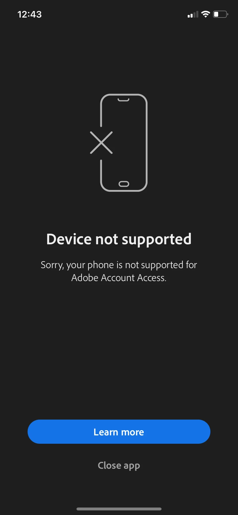 Does anyone know how to troubleshoot this issue? I downloaded the Adobe Account Access app to sign in to Adobe Creative Cloud on an Android device and it works perfectly. I downloaded it on to an iPhone 11 running IOS 14.2 from the App Store (https://apps.apple.com/us/app/adobe-account-access/id1514571935) and after installing it on the device, I immediately received an error message upon opening it that said "Device not supported" and was given only two options: a blue button that said "Learn More" and when clicked took me to this page https://helpx.adobe.com/manage-account/using/passwordless-sign-in-adobe.html and another button that said "Close App." I've read everything on the link from the "Learn More" button, including the FAQ at the bottom about this issue. The iPhone meets all the requirements of the FAQ but I'm still getting the error message. Any suggestions?