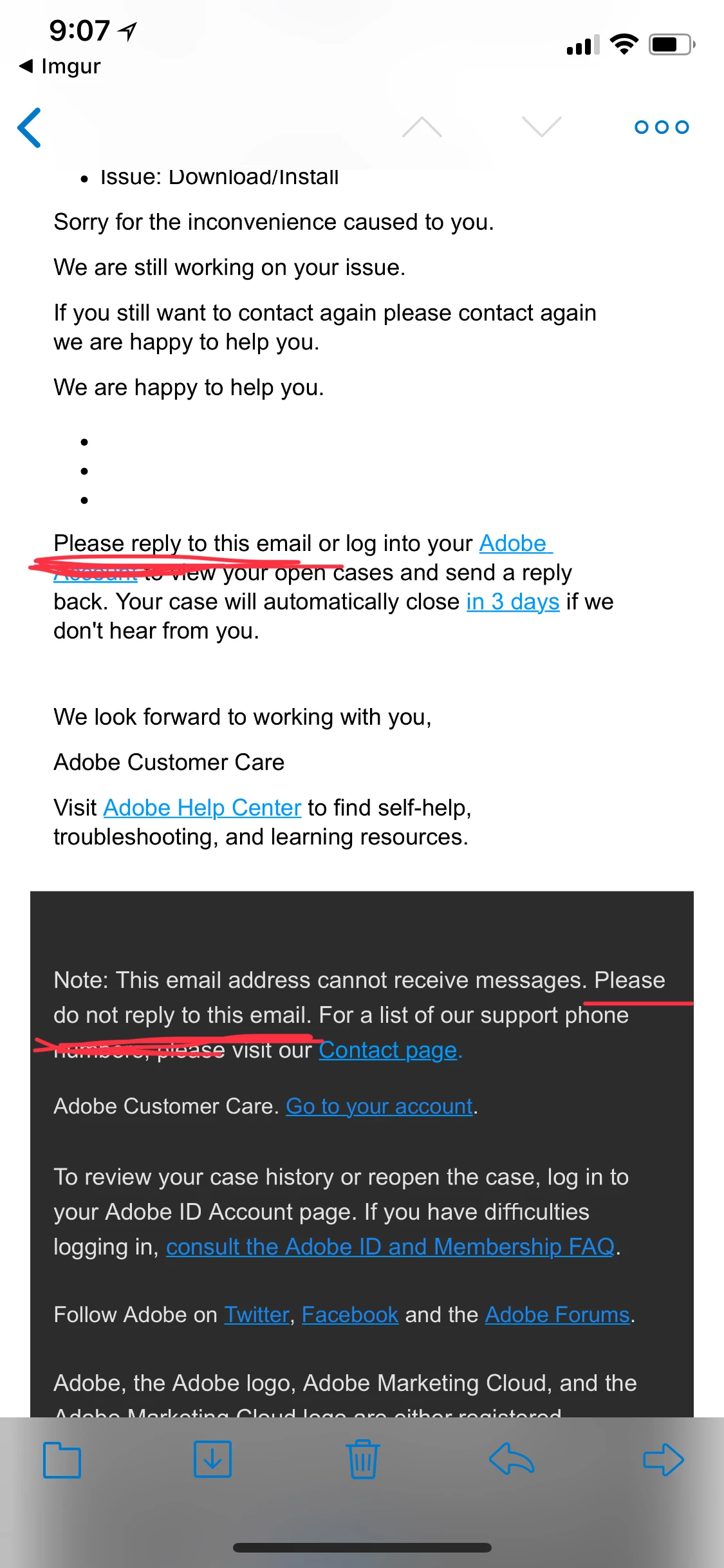 Now, you see how it said to reply to that email or log into my Adobe account to find instructions and view my case? Neither work. I replied to that email. Since then I have received five different emails, each with a different case number, each telling me to either reply to that email within X-amount of days or log into my account within X-amount of days or they will mark my issue as resolved.