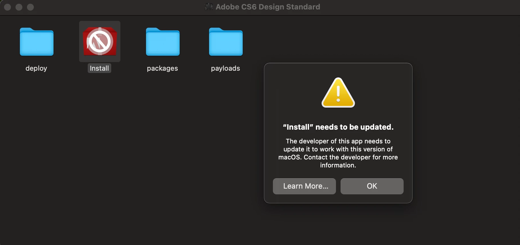 I recently got the new Macbook Air 2020 and I was hoping to download my CS6 suite to it, however when I download it, it says "Install needs to be updated. The developer of this app needs to update it to work with this version of macOS. Contact the developer for more information." Is there anyway around this? It's pretty frustrating that I bought this suite just for it to be unusable within 10 years.