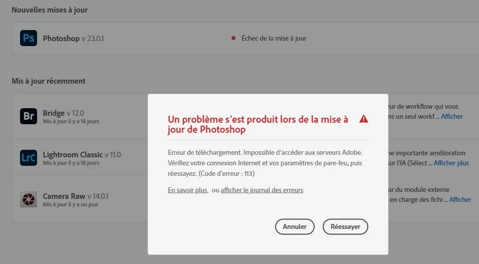 j'essaie continuellement de mettre à jour Photoshop vers la version v 23.0.1, mais je me heurte chaque fois à un échec avec le Code d'erreur 113.