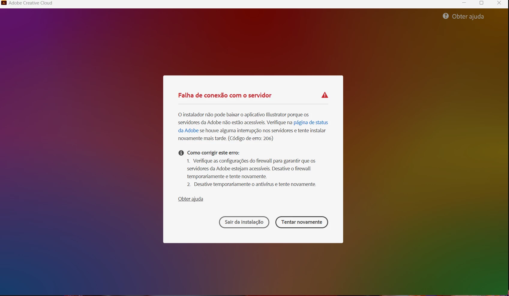 adquiri recentemente o pacote adobe porém quando vou instalar os aplicativos que precisso (Photoshop, Ilustration, Premiere) conta erro de firewall assim como na imagem em anexo. Ja desativei o antivirus como suger