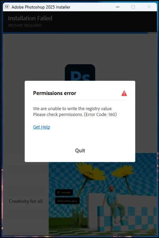 Error 160 during installation of Adobe Photoshop at the very end of installation. I can't figure out what rights and what registry branch to give them to. Program version 2025 [v 26.6.0.14].