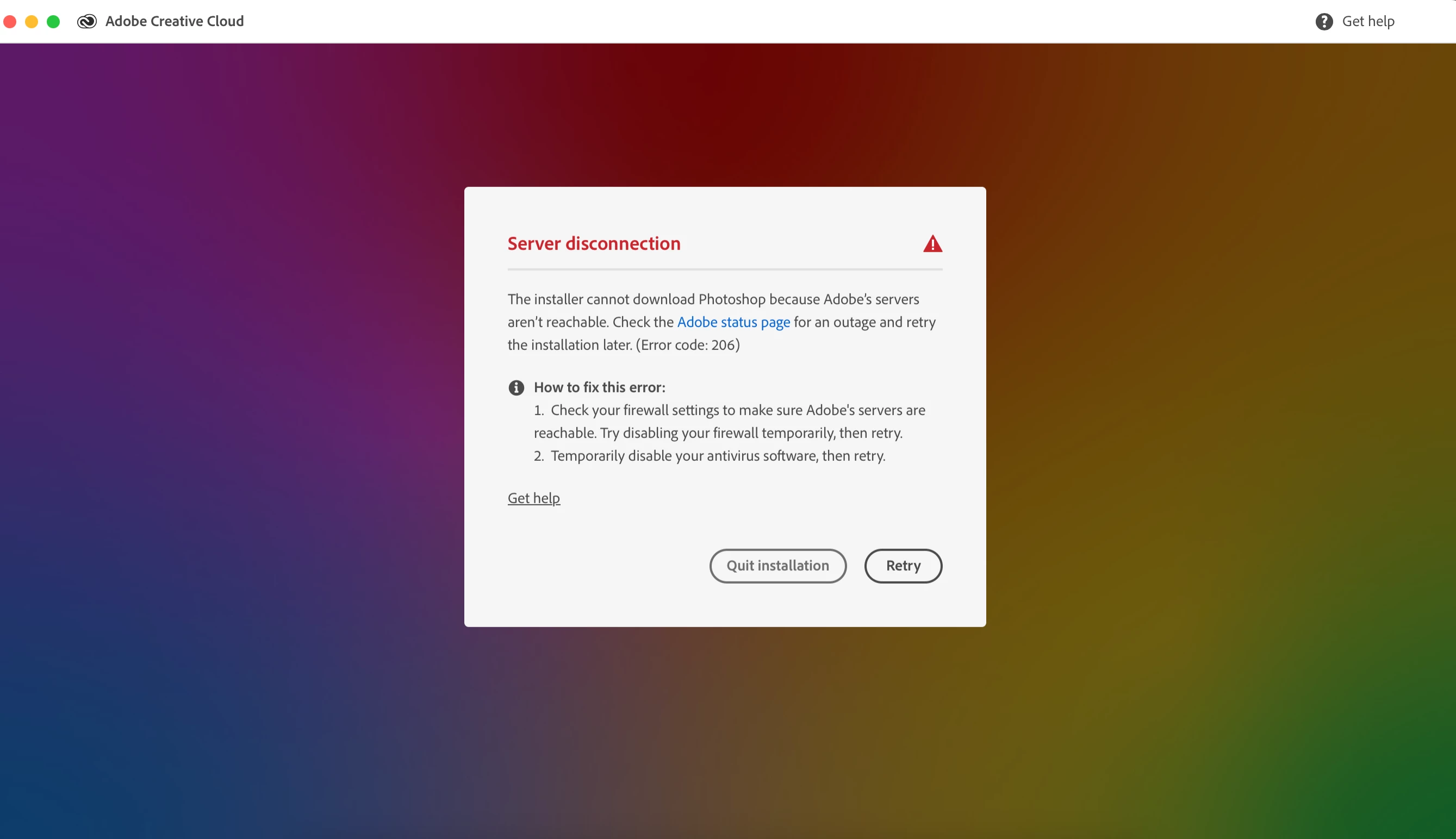 I then tried to delete every file and uninstall CC and install it again, but since then I've received this error. I have tried to reconnect to other Wi-fi, my firewall is off, and despite this message, my browser will say I'm signed in.