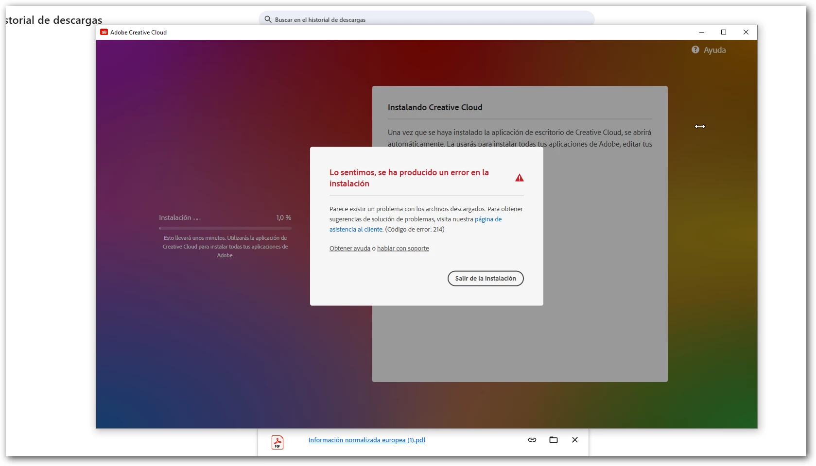 gabi1200Known ParticipantForum|Forum|2 months agoNovember 17, 2025QuestionError 214 al instalar Creative CloudForum|Forum|2 months agoNovember 17, 20251 reply72 viewsAl abrir Creative Cloud, se ha iniciado una actualizacion, y me ha dado el error 214.He desinstalado Creative Cloud y he intentado volver a instalarlo. pero me vuelve a dar el error 214.En este estado no puedo actualizar mis aplicaciones de escritorio. Alguna solucion? GraciasInstallationCreative Cloud