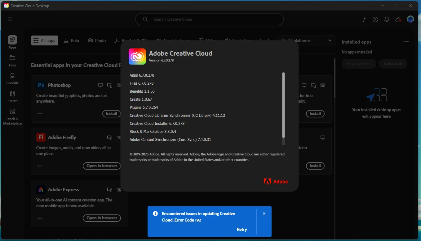 So I tried backing some projects up to CC through Premiere Pro; however, it wouldn't let me as the options were greyed out. I went and checked and saw that the CC needed an update, but when updating it I received Error Code 192. I tried uninstalling multiple time, but it would still give me the same thing after each reinstall and repair.