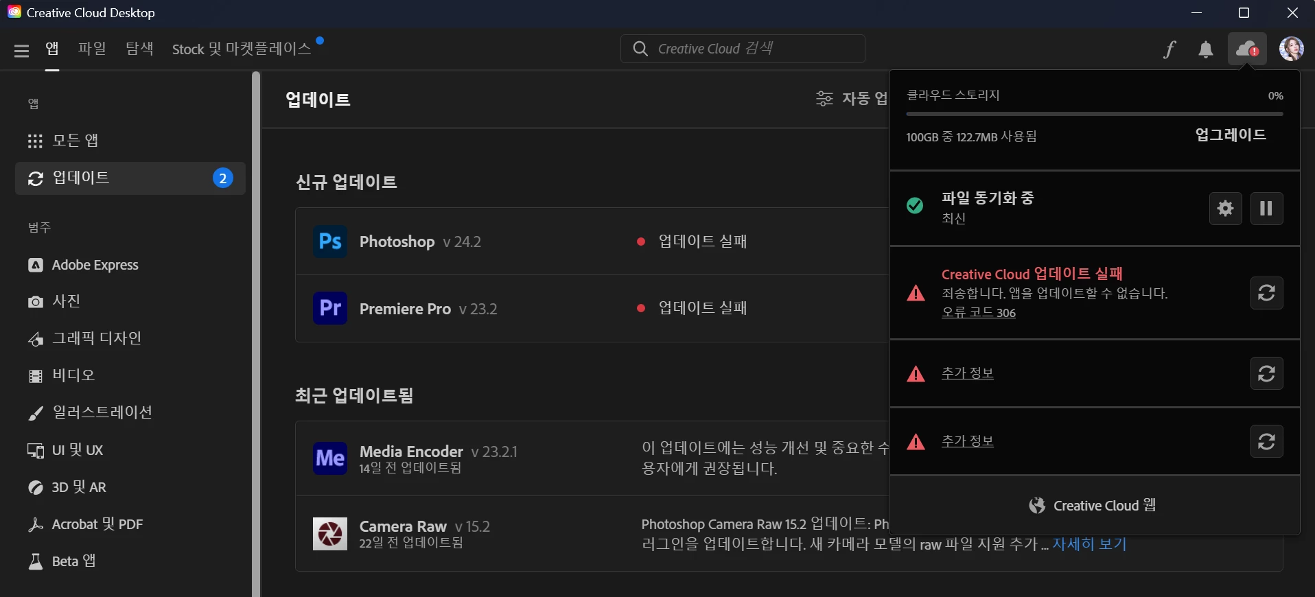 Error code 306: Unable to update the products (KOREAN, 한국어)
