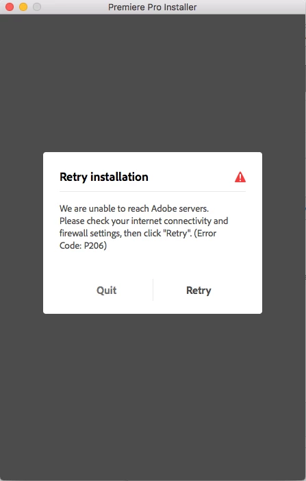 "We are unable to reach Adobe servers. Please check your internet connectivity and firewall settings, then click "Retry". (Error Code: P206)"