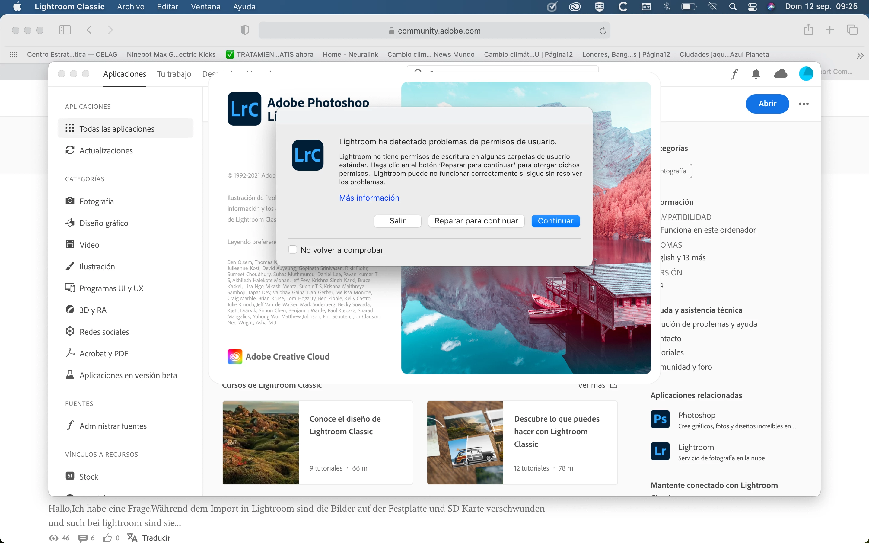 Desde hace unas semanas aparece este mensaje al abrir Lightroom. No sé como solucionarlo. El pago y la cuenta está correcta. Agradezco si me pueden ayudar. Gracias