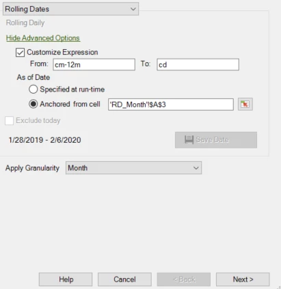 Rolling dates, custom expression calling wrong start month date. The anchored cell has the date: 2/6/2020, so 12 months before the current month should call 2/4/2019.. Any idea why the previous week is included?