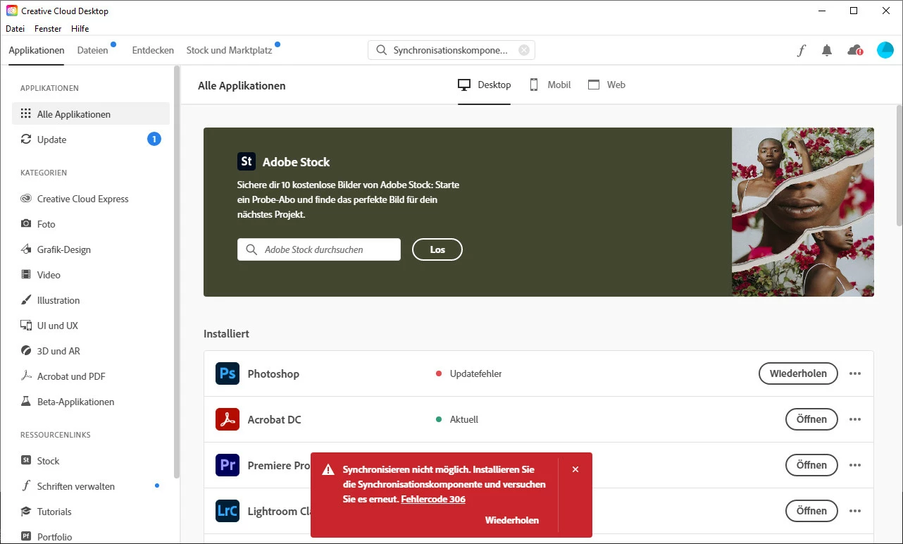Ich bekomme immer wieder den gleichen Fahlercode (306) bei updaten der Applikationen in der Creative Cloud. Was kann ich machen.