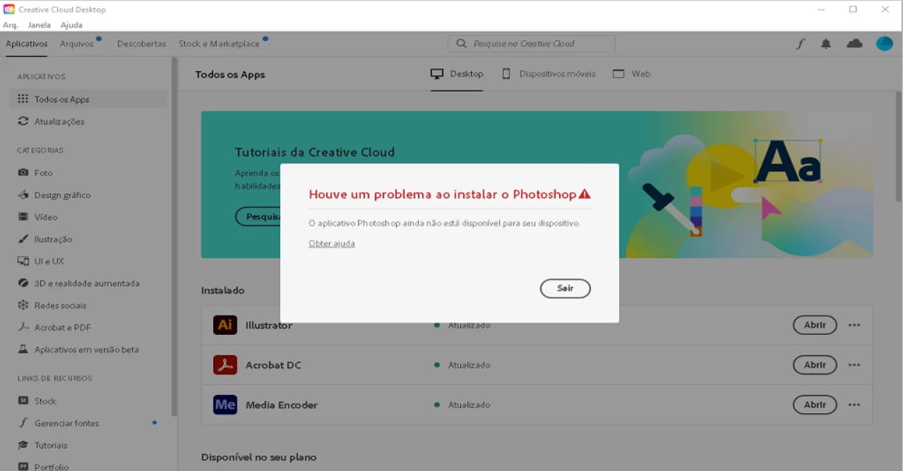 Estou com este problema ao tentar instalar o Photoshop via ADOBE CC.