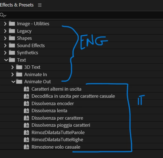 Problem is, it looks fine until I open the effects. Main effects folders are all in English BUT the actual effects are in Italian.