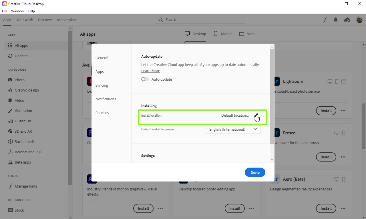 How do I change the default drive for the Adobe apps to D:\Program Files?