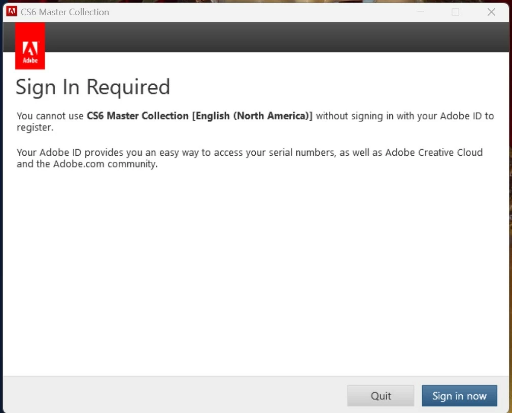 - The Suite Installs okay, but when trying to open a program, at first, it works, using the button, "Sign In Later"; Updates work too on the first place, on all the suite's Programs... if any, ... and then: