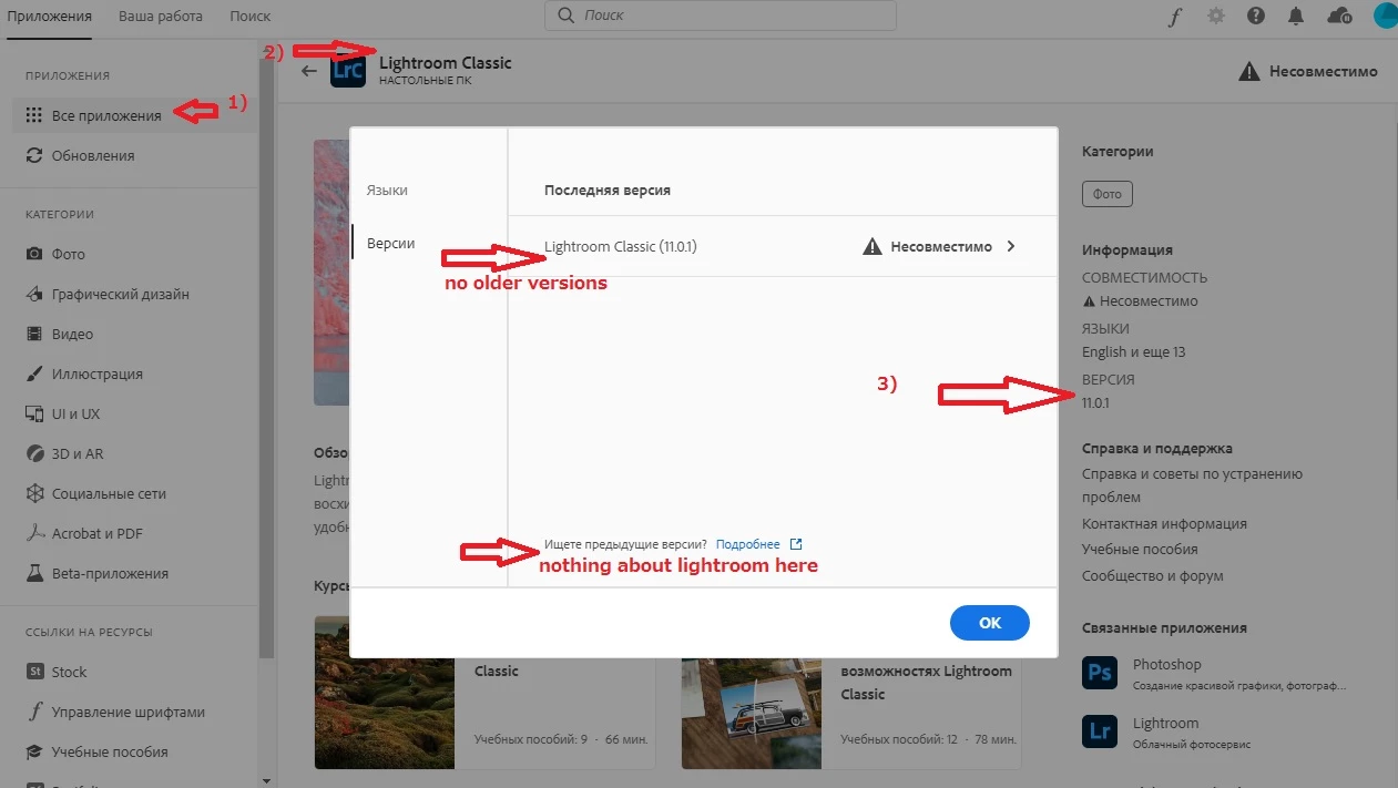 Current version of LR cannot be installed due to system requirements. When I click "version" on LR classic screen in creative cloud I see only last version, and link "read about older versions", it leads here: