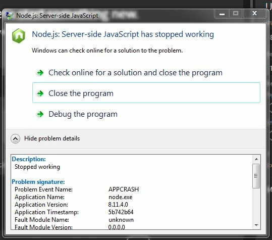 how to fix node.js server-side javascript has stopped working issue
