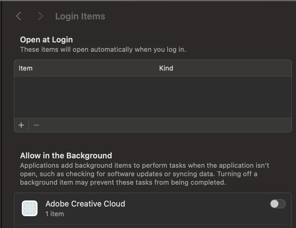 how to uninstall adobe creative cloud from login items on MacOS 14.1?