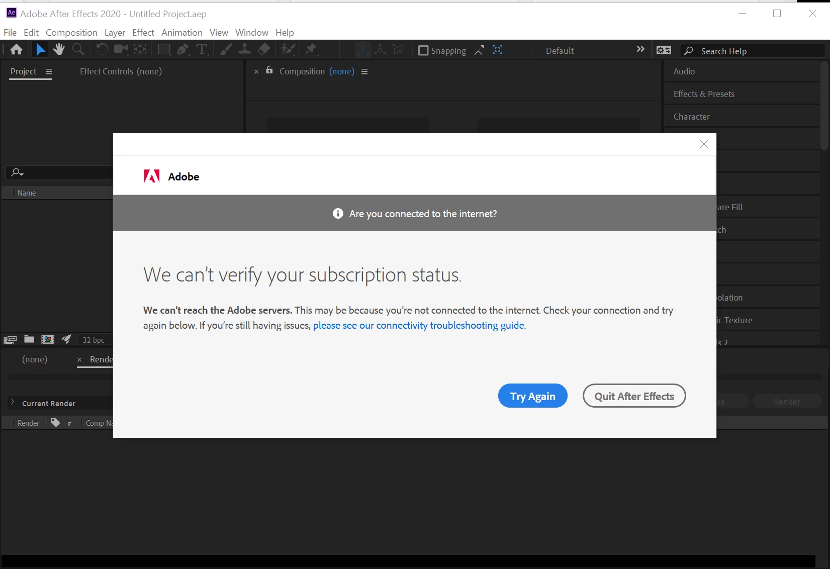 Keine Verbindung mit Adobe-Servern möglich. Möglicherweise besteht keine Verbindung mit dem Internet. Überprüfen Sie Ihre Verbindung und versuchen Sie es unten erneut. Wenn weiterhin Probleme auftreten,